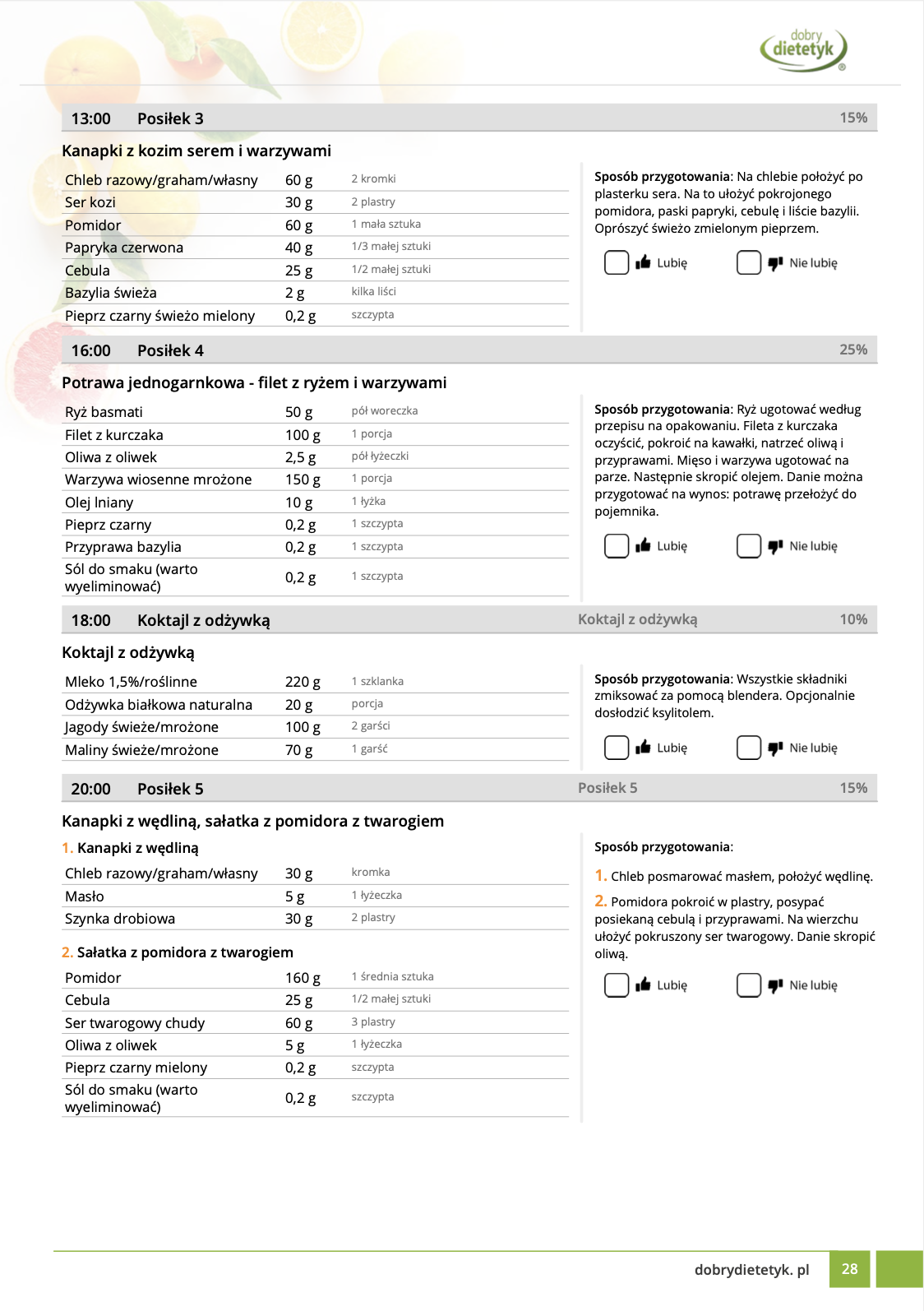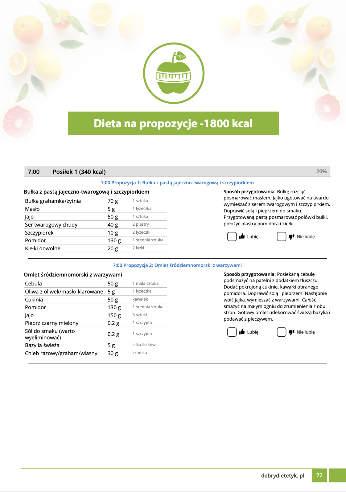 • w formie propozycji posiłków (zamiast pojedynczych jadłospisów jednodniowych, przygotowano propozycje kilku propozycji dań na każdy posiłek). Tutaj nie uzależniamy Cię od tego jakie masz np. w danym dniu zjeść śniadanie czy obiad, tylko sam wybierasz sobie ulubione danie z kilku przedstawionych przez nas propozycji.