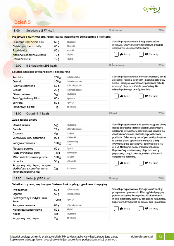 w formie propozycji posiłków (zamiast pojedynczych jadłospisów jednodniowych, przygotowano propozycje kilku propozycji dań na każdy posiłek). Tutaj nie uzależniamy Cię od tego jakie masz np. w danym dniu zjeść śniadanie czy obiad, tylko sam wybierasz sobie ulubione danie z kilku przedstawionych przez nas propozycji.