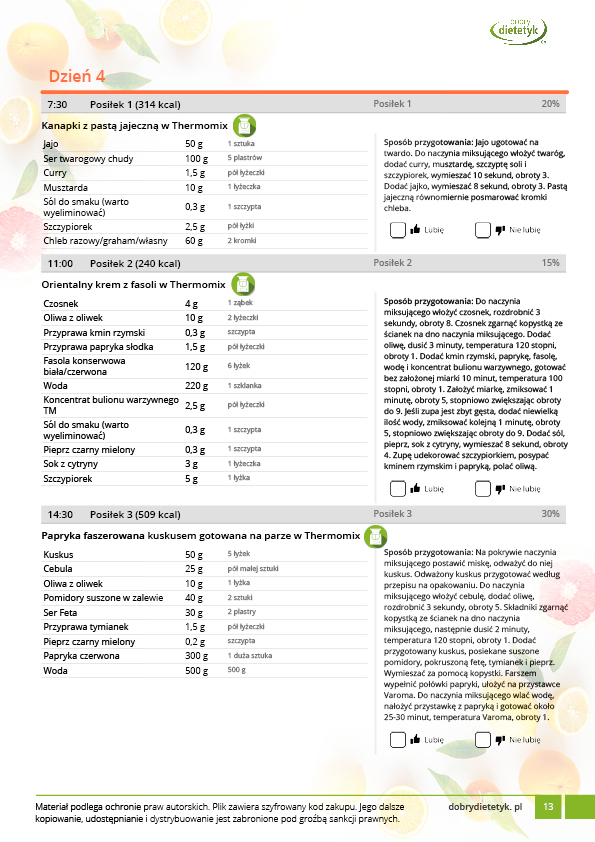 Kompleksowy, 30 dniowy program dietetyczny dla WEGETARIAN z przewagą dań na THERMOMIX. Jadłospis oparto o produkty pochodzenia roślinnego z niewielkim dodatkiem produktów mlecznych i jaj. Dieta została skomponowana przez zespół dietetyków specjalizujących się w tematyce diety wegetariańskiej. Ta bardzo urozmaicona, niezwykle pożywna i wyjątkowo smaczna dieta zadowoli każdego, kto szuka zdrowych i wartościowych dań wegetariańskich. Pod względem odżywczym w diecie położono w szczególności nacisk na podaż takich składników jak białko, żelazo, witaminy grupy B oraz wiele minerałów których często brakuje w dietach roślinnych. Dieta idealnie nadaje się dla osób, chcących też spróbować takiego modelu żywienia.