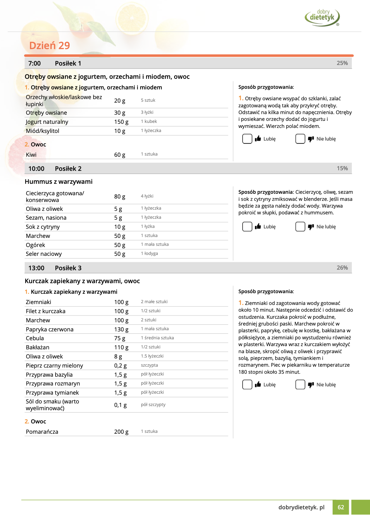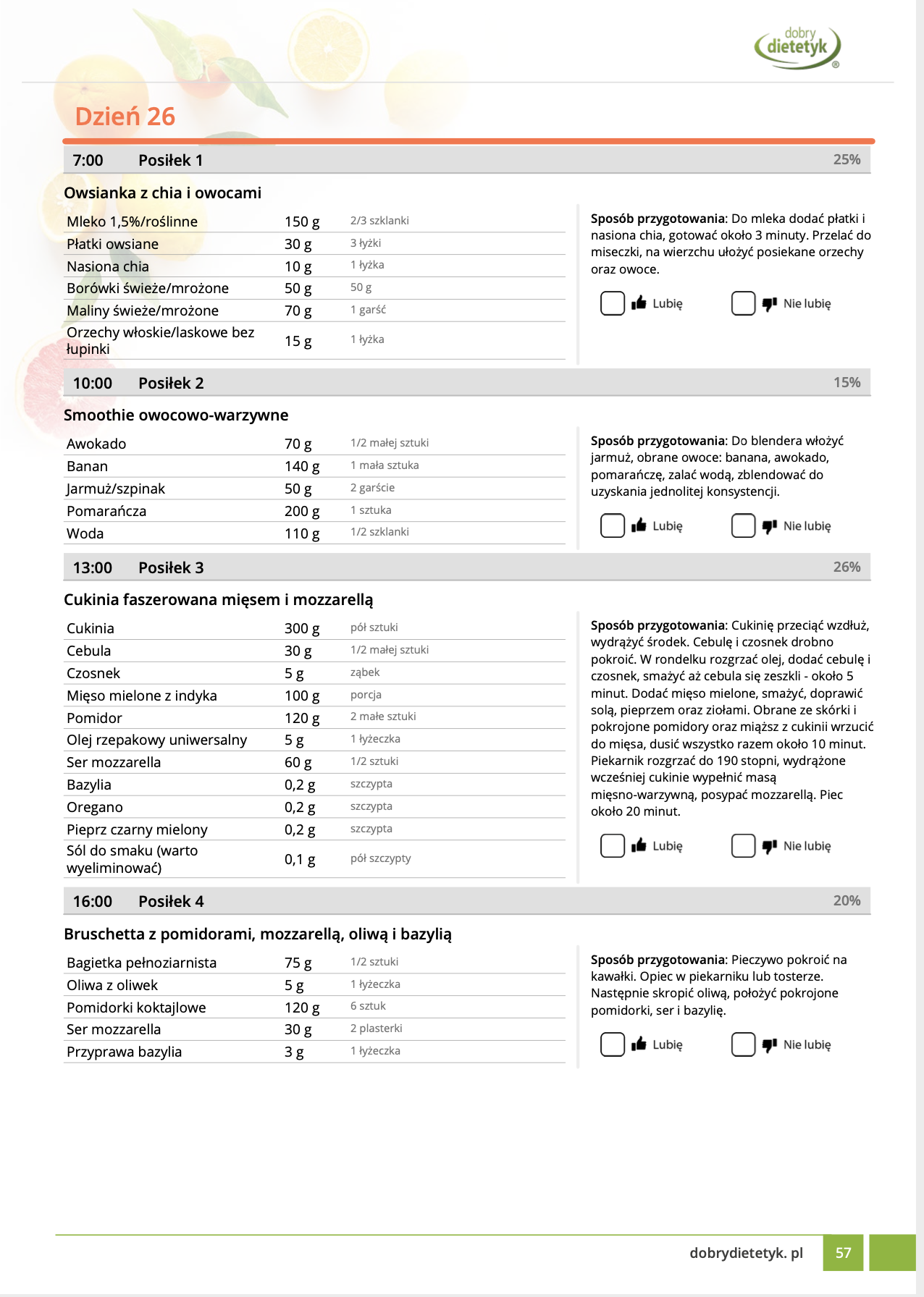 w formie propozycji posiłków (zamiast pojedynczych jadłospisów jednodniowych, przygotowano propozycje kilku propozycji dań na każdy posiłek). Tutaj nie uzależniamy Cię od tego jakie masz np. w danym dniu zjeść śniadanie czy obiad, tylko sam wybierasz sobie ulubione danie z kilku przedstawionych przez nas propozycji.