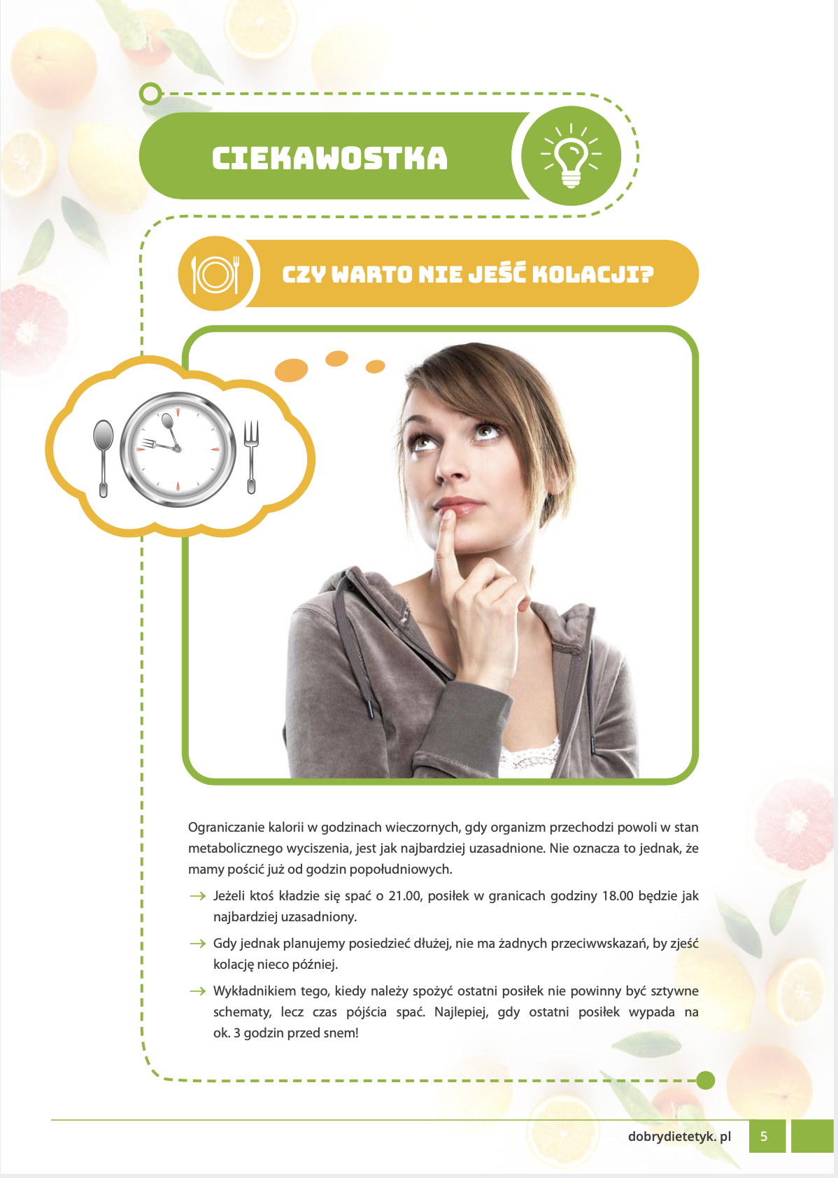 Dodatkowo do opracowanego planu dietetycznego otrzymasz atrakcyjnie przygotowane ciekawostki i wiadomości żywieniowe, które mam nadzieję pozwolą Ci zrozumieć wiele spraw związanych z nurtującym Cię problemem, a także przyczynią się do zwiększenia ogólnej wiedzy żywieniowej.